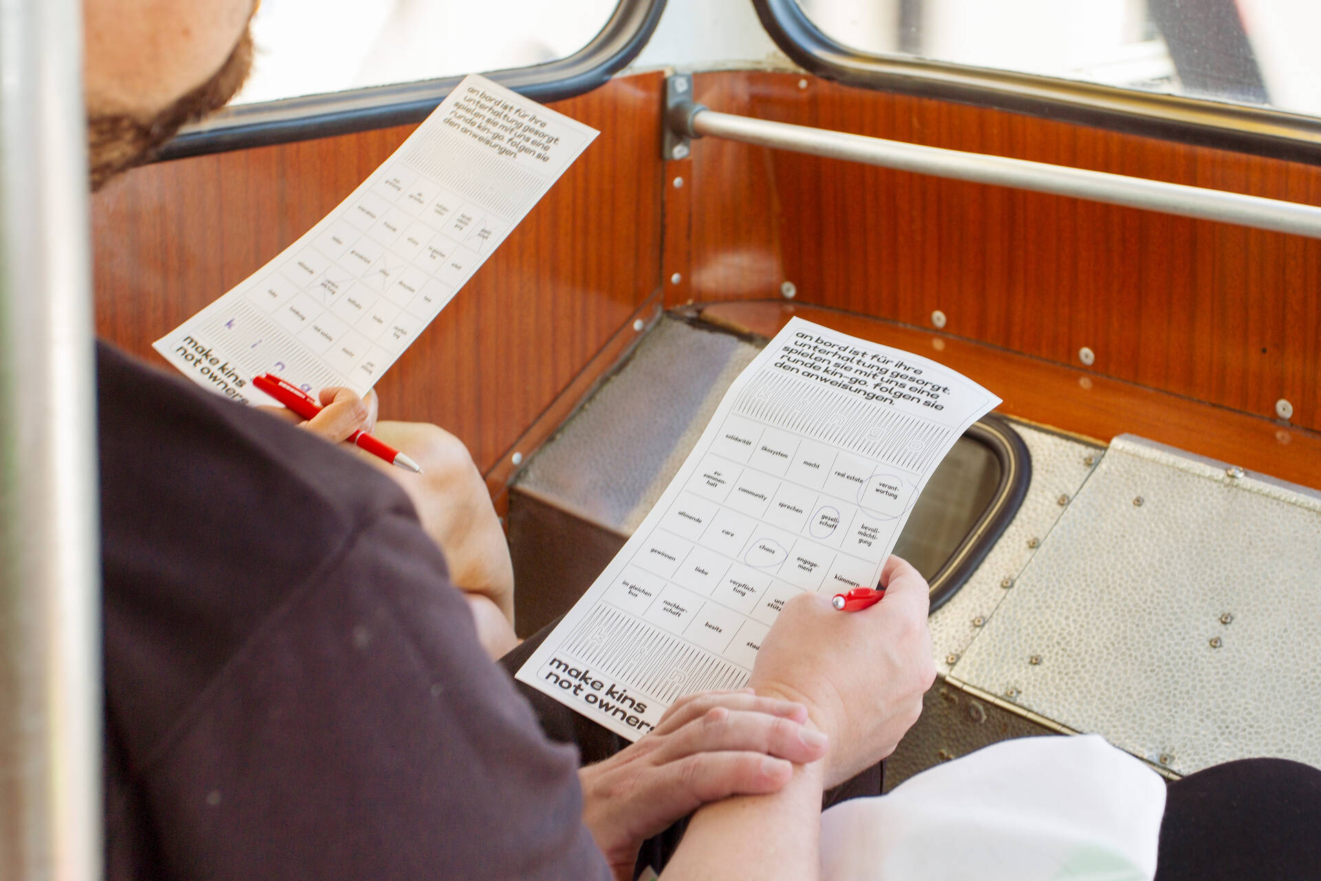 Bitte bedenken Sie, dass sich der nächstliegende Notausgang auch hinter, über oder unter Ihnen befinden kann. Wer war letztes Jahr bei Detours? Wer hat eine Eigentumswohnung? Wer hat keine Angst vor Verdrängung? Wer fährt U2? Wer macht Stadt? Das Publikum reagiert spontan mit den grünen Karten und wird danach mit Ruder- und Fahrradübungen aufgelockert. Für »Kin-Go« werden zufällige Begriffe gezogen und auf der Sicherheitskarte angekreuzt. Gesellschaft, Verantwortung, Liebe… sitzen wir am Ende nicht doch alle im gleichen Bus? Das Wachklopfen am ganzen Körper endet mit einem gemeinsamen lauten »HA!«, wobei die Zunge ganz weit raus gestreckt wird und geht schlagartig in «Quiz Time« über. Wer entscheidet über ungenutzte Freiräume? Was ist öffentlicher Raum? Am Anschutz-Areal neben der (Mercedes-Benz-) Uber-Arena streikt der Motor. Hier geht nichts mehr weiter, genau so wie in den privatwirtschaftlichen, gewinnmaximierten und am Wohnungsbedarf vorbei optimierten Büro-Türmen. Was kotzt Sie an? Die Kotztüten liegen bereit. Lassen sie es raus! Nach all der Aufregung laden wir das Publikum auf eine kosmische Kinship Reise ein. Die »Relaxation Mask« verbindet uns, es wird ruhig, das Dach des Busses löst sich auf und ein leichter Sommerwind weht durch die Reihen. »make kins not owners« ist ein Plädoyer gegen den besitzfixierten Ausverkauf der Stadt und für mehr Kin, mehr Verbundenheit mit der lebendigen Welt der Stadtbewohner:innen.